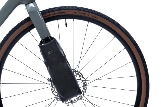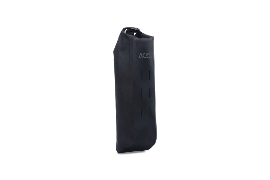 The one-litre ACID PACK PRO 1 drybag is made to work with the ACID FORK CAGE front fork carrier. Its waterproof welded construction uses abrasion-resistant outer material for a long lifespan over many miles. Mounts to the ACID FORK CAGE or directly to other bags using the included touch fastener straps through the MOLLE loops for a super-flexible way to carry extra load. Contact patches with the ACID FORK CAGE are reinforced for added longevity. Reflective details improve visibility in low-light conditions.