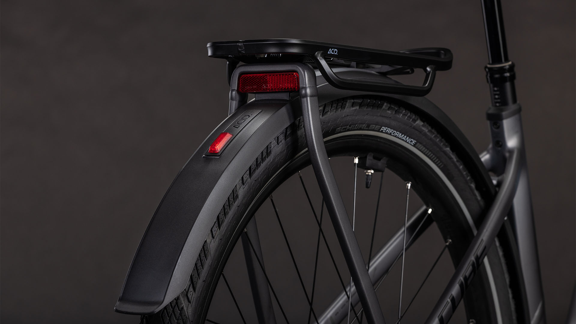 Under its clean, elegant lines the Kathmandu Hybrid Comfort Pro by CUBE has some really clever stuff going on. The Enviolo hub gear is stepless, for starters. That means you just twist until you're comfortable – no such thing as the "wrong" gear. It's also belt-driven, which means no more oily chain. The Bosch CX drive provides up to 90Nm of pedal assistance, making any route – even hilly ones – a breeze. With its 800Wh PowerTube battery you've no range worries, either. Strong Shimano hydraulic disc brakes work reliably in all weathers, and there's a Suntour air suspension fork, adjustable stem and parallelogram seatpost. Add the Integrated Carrier 3.0 and a full range of accessories, and you're all set.