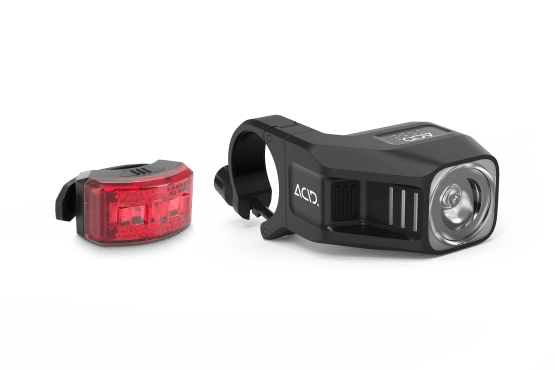Stylish and packing the power! Our Light Set contains the ACID Front Light PRO 80 and the ACID Rear Light PRO to keep you safe in all conditions. Complies with German road traffic regulations (StVZO), splashproof and easy to recharge using a Micro-USB charging cable. The asymmetrical design of the front light allows it to be positioned centrally to maintain a sleek cockpit. Assembly is a cinch with the Slide-Lock handlebar mounting system and the silicone strap – no tools needed.