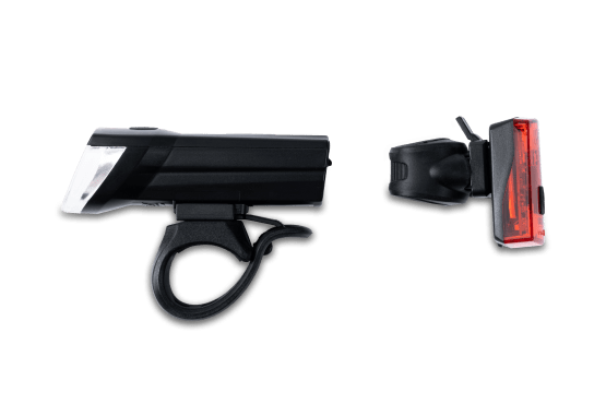 The German road traffic regulation-approved (StVZO) CUBE RFR Light Set TOUR USB CMPT with LED technology contains an RFR Front Light TOUR USB CMPT and an RFR Rear Light USB CMPT. A 30 lux front light illuminates the way ahead, while at the rear the tail light has a brake sensor function for added safety. The IPX4 housings are splashproof, while a battery indicator lets you know when you're running out of power so you're never plunged into darkness. Integrated batteries mean the lights are easy to recharge using the included Micro-USB charging cable. The lights mount to your handlebars and seatpost, no tools needed, and the angle is adjustable, too.